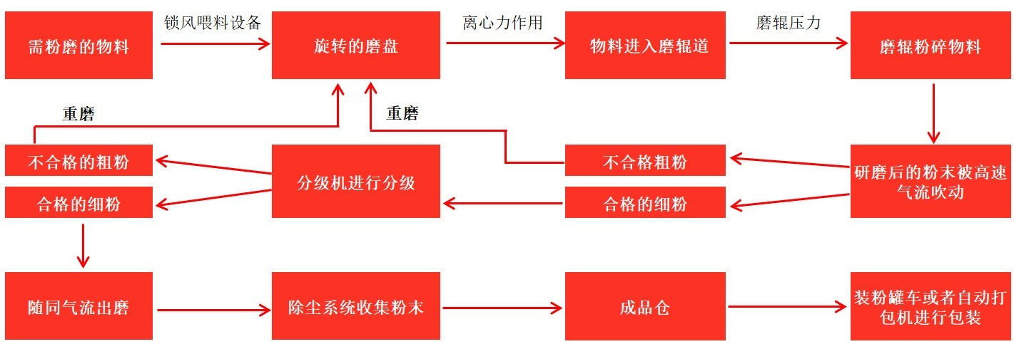 粉磨后的物料經(jīng)分級(jí)系統(tǒng)進(jìn)行分級(jí),不合格的粉體經(jīng)分級(jí)機(jī)分級(jí)后返回主機(jī)重新粉磨。